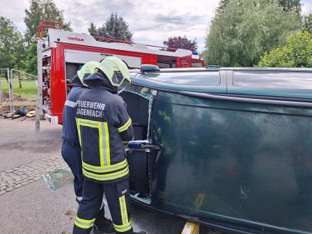 Rettung der Person aus dem Fahrzeug wurde das Fahrzeug wieder auf die Räder gestellt. Im zweiten Teil der Übung kam der neue Rettungssatz voll zum Einsatz: Die Türen wurden geöffnet und das Fahrzeugdach entfernt.